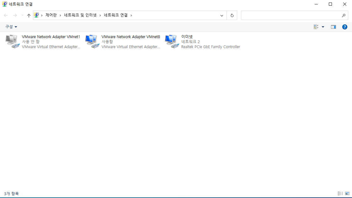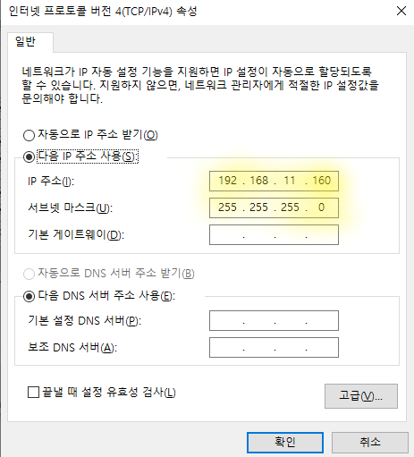 V제어판 - 네트워크 상태 및 작업 보기 - 어댑터 설정변경 - VMnet8 - TCP/IPv4 - 속성 - 설정