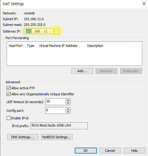 VMnet8 : IP, Subnet mask / NAT Settings : Gateway(192.168.11.1)